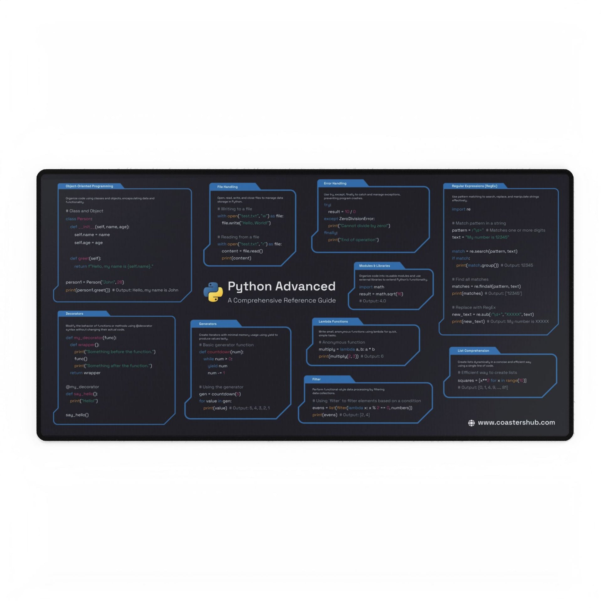 programLevel up your programming skills with the Advanced Python Cheat Sheet Mousepad, the ultimate tool for seasoned developers who want to keep advanced Python concepts within arm’s reach. Designed for productivity and precision, this mousepad combines essential Python references with a sleek, functional design to keep your workspace organized and efficient.