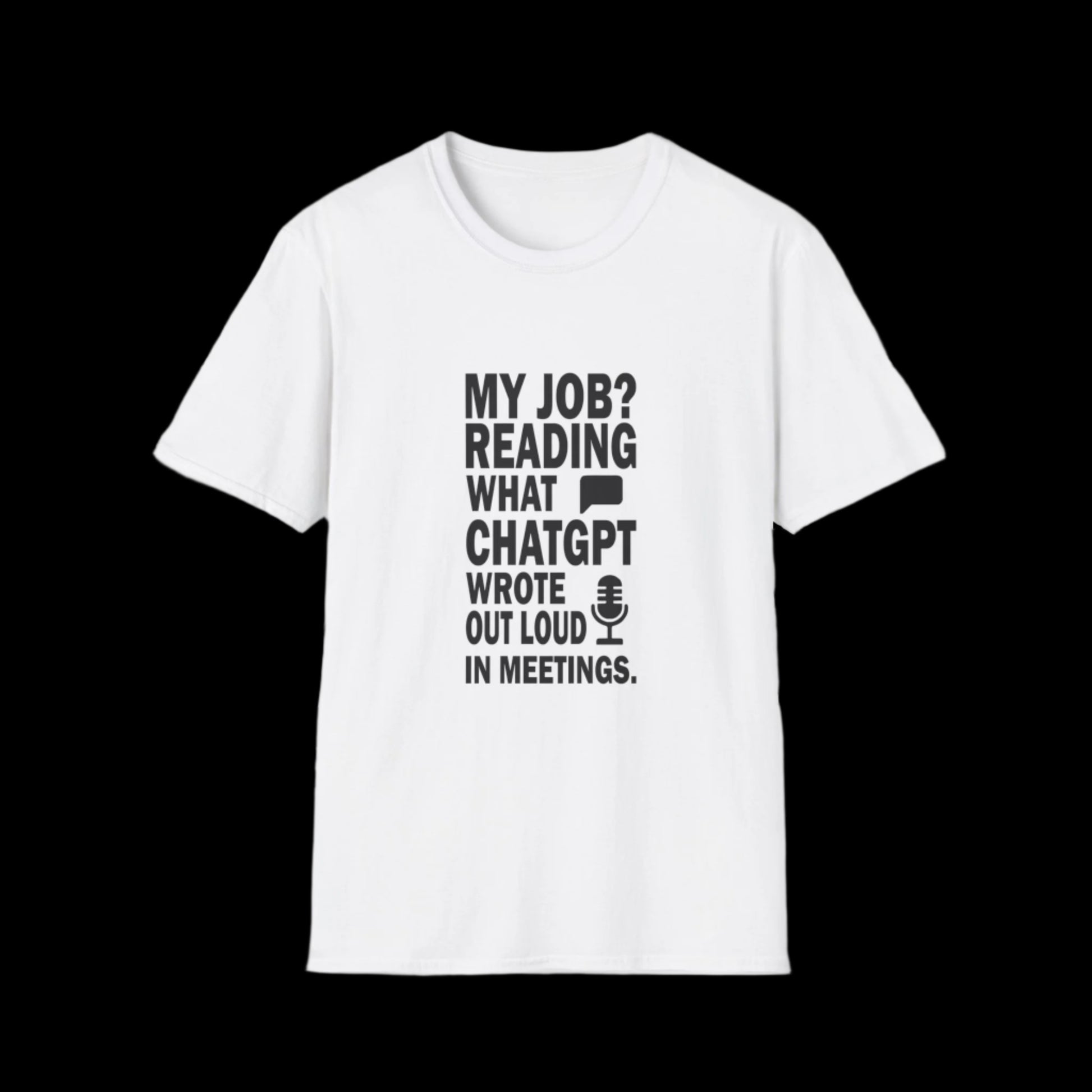AI themed t-shirt that says, "My Job Reading what Chat GPT wrote out loud in meetings". This unisex softstyle t-shirt is made with 100% ring-spun cotton, offering a lightweight and comfortable feel. Perfect for tech enthusiasts and AI professionals, this shirt adds a touch of humor to your wardrobe. Ideal for casual wear or as a conversation starter at tech events and meetups.