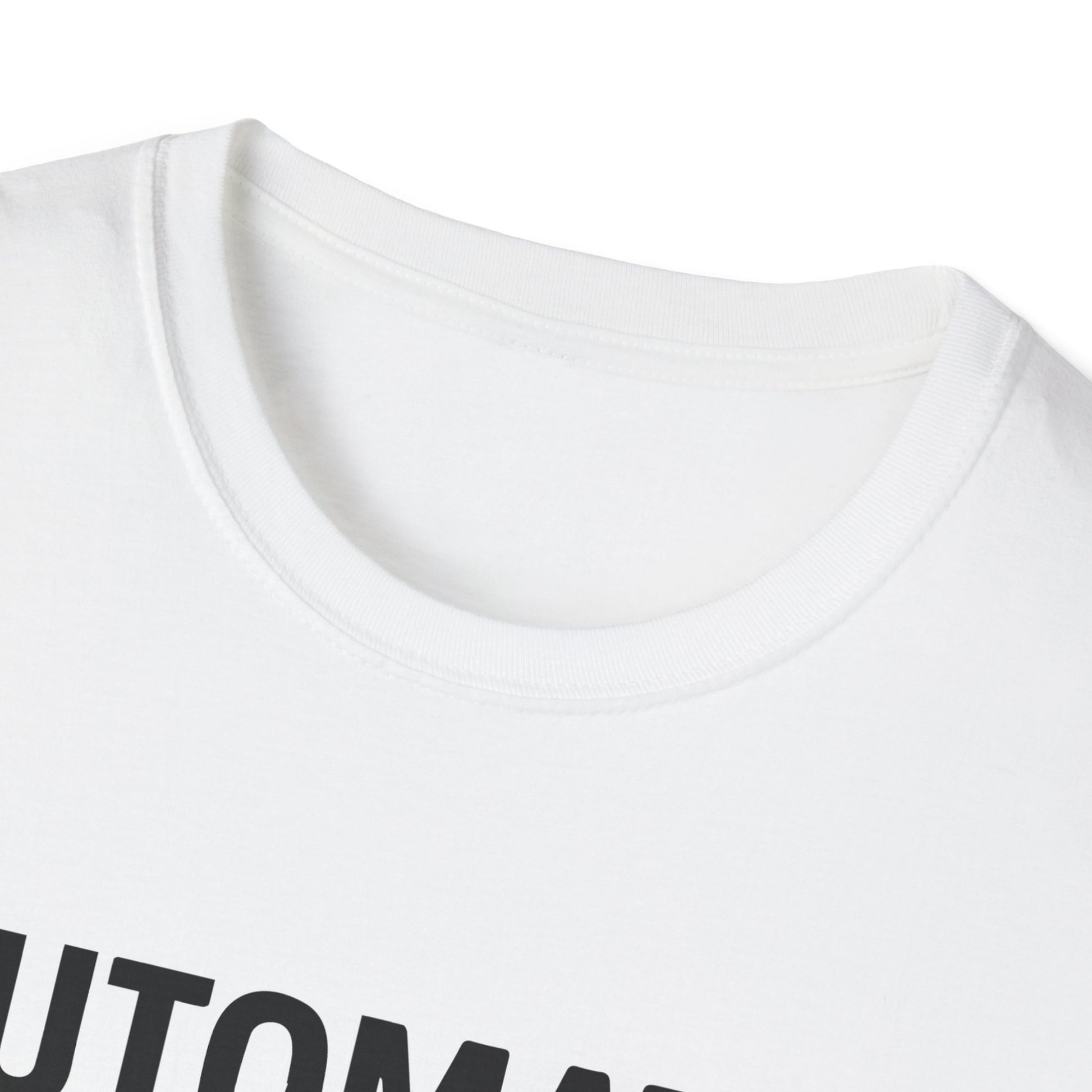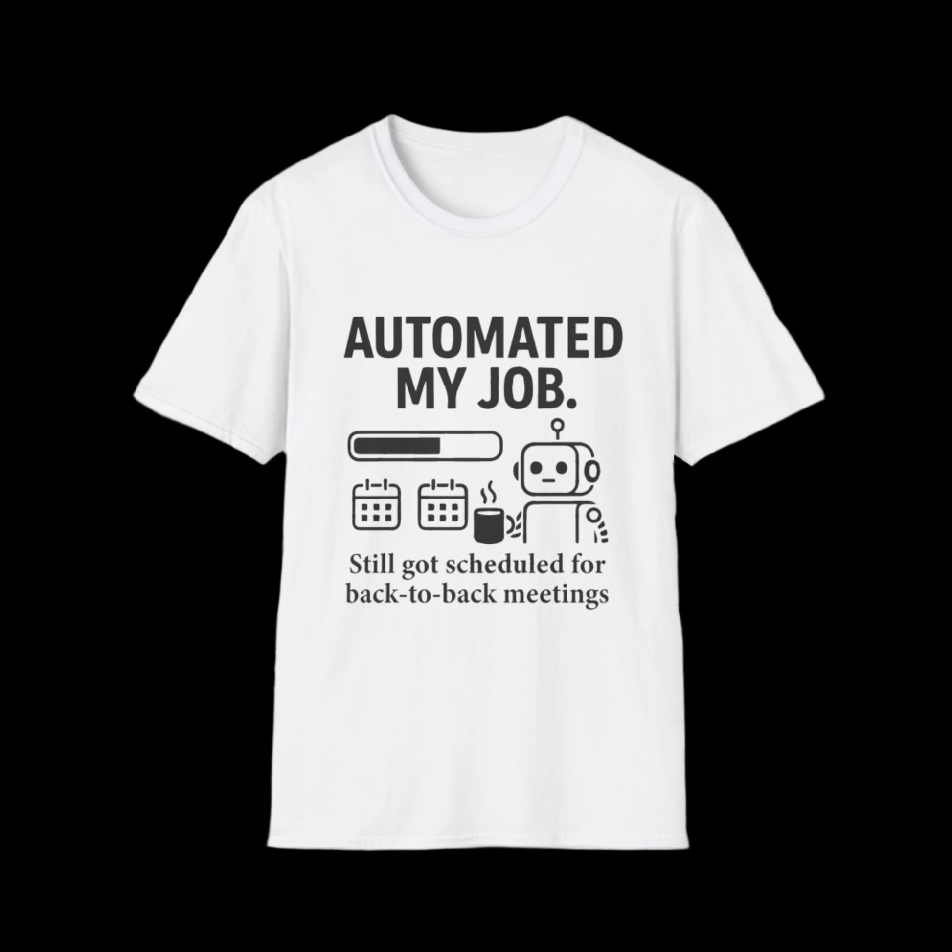 A funny AI humor T-Shirt that says, 'Automated my job, still got scheduled for back-to-back meetings'. This T-Shirt delivers a light-hearted and relatable message for those in the tech or office work industry. Perfect for casual wear or as a conversation starter, suitable for adults.